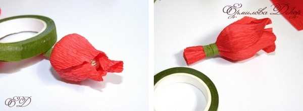 Взять рулончик клейкой ленты, обмотать несколько раз вокруг основания бутона, и далее наматывать ее вниз по проволочному стеблю до самого конца проволоки.