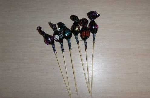 2. Заверните конфету так, как это показано на фото. Хвостиками фольги оберните и закрепите шпажку.