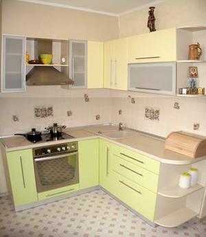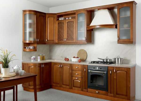 Г-образный (иначе говоря, угловой) достаточно практичен, поскольку подразумевает размещение всех функциональных зон рядом друг с другом. Однако нужно грамотно спланировать расположение ящичков и дверок, чтобы они не создавали неудобств для хозяйки.