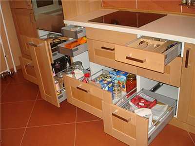 Выдвижные ящики вместо обычных нижних шкафчиков — настоящая революция в подходе к хранению и готовке: вы сможете добраться до любой внезапно понадобившейся вещи в одно движение, не садясь на корточки и не вытаскивая сперва все, что лежит на вашем пути. При этом вам не обязательно менять мебель: вы можете навесить фурнитуру для выдвижных корзин или полок в ваш старый шкафчик.