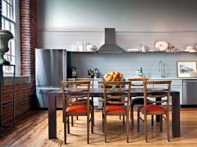 Такое помещение достаточно просторно, поэтому в него гармонично впишется как прямой, так и угловой или островной тип планировки.