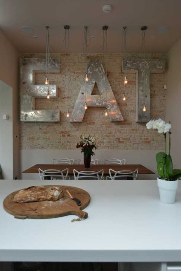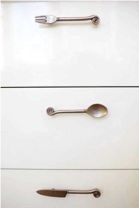 Можно декорировать кухню старыми вилками и ложками. Попробуйте выгнуть вилку дугой и сделать из её зубьев рокерскую «козу», знак победы или другие композиции. Прикрутив такой «шедевр» к стене вы получите прекрасные вешалки для прихваток и полотенец.