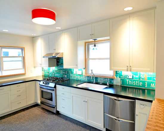 Покрашенные, кирпичные и панельные кухонные фартуки выглядят очень симпатично, но когда дело доходит до уборки, начинаются проблемы. В среде, где повышенные температуры, брызги жира, соусов и воды — обычные условия, вам понадобится действительно выносливый кухонный фартук. Керамическая плитка, закаленное стекло или панель из нержавейки справятся на отлично.