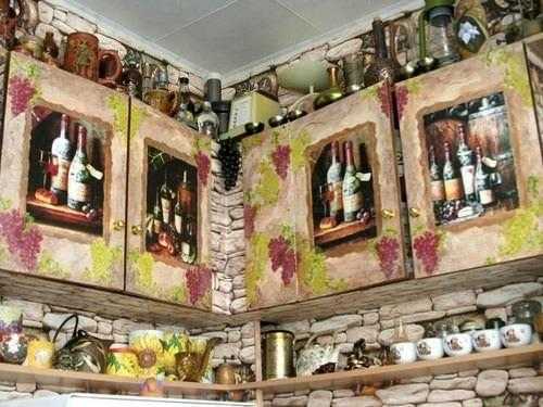 - Еще один бюджетный вариант – сделать декупаж поверхностей с помощью обычных цветных салфеток. Одной банки лака хватит, чтобы обработать все фасады, украшенные бумажными узорами.