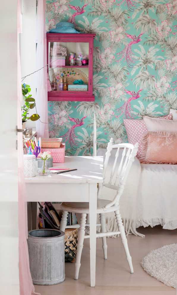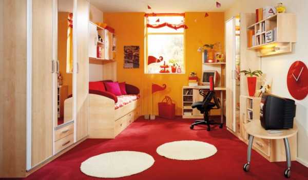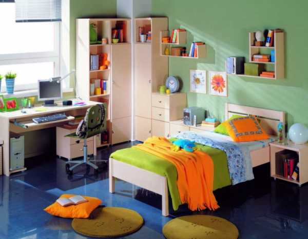 О подборе цветов для детской следует сказать отдельно. Для нее хороши светлые, не слишком яркие и темные тона. Известно о возбуждающем эффекте красного, поэтому допустим он только для вялых и флегматичных детей, угнетающем действии синего (лучше предпочесть голубой, цвет неба и моря, и подросткам он, кстати, подходит лучше, чем малышам). Зеленый нареканий не вызывает, неплох желтый, светло-оранжевый. Письменный стол должен быть неярким и не особенно светлым.