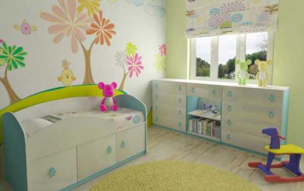 — в основе интерьера должны быть светлые оттенки. Это зрительно расширяет помещение. Но однотонные обои быстро наскучат маленькому обитателю комнаты. Поэтому выбирайте светлый фон, на котором будут изображены подходящие рисунки: герои мультфильмов, зверушки, цветы и т.д.