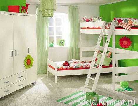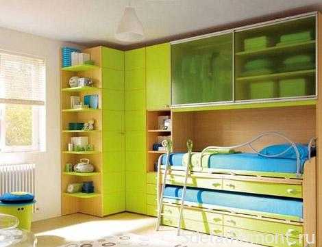 Как обустроить детскую комнату для двоих, прежде всего, детская мебель должны быть прочной и безопасной. Специалисты советуют отказаться от вещей из ДСП, ведь для их изготовления используют слишком много клея. Лучшим материалом, хотя отнюдь не самым дешевым, является натуральная древесина. Покупая вещи в комнату, непременно требуйте у продавцов гигиенический сертификат и обходите сомнительные магазинчики и места на рынках, где вам могут продать неизвестно что и неизвестно какого качества. Предметы в детской комнате должны быть без острых углов, простой формы и с большими деталями. Обустраиваем детскую комнату фото: