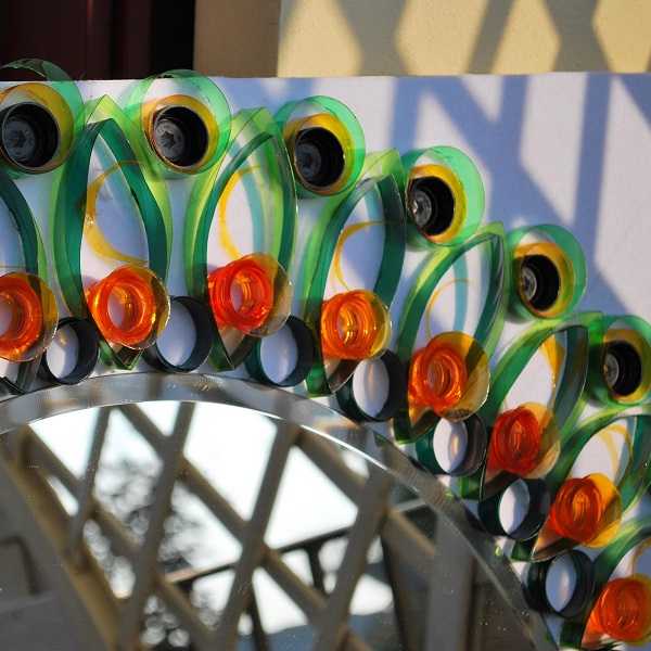 Креативный подход к делу может стать отличным инструментом в получении очень даже стильного аксессуара. Мы назвали данную идею «Круг в кругах» потому, что круглое зеркало обрамляется несколькими десятками белых, пластиковых колец.