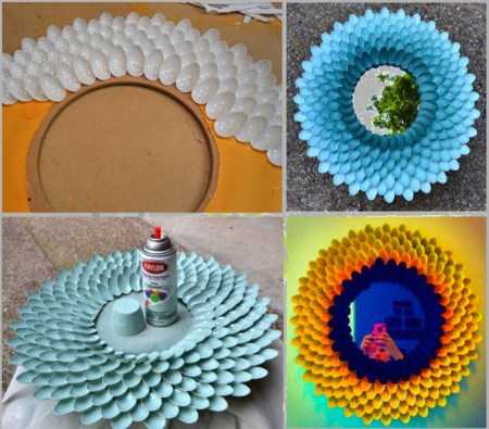 В современный интерьер отлично впишутся зеркала с декором из пластиковых ложек и прищепок. На фотографиях ниже видно, что сделать такие зеркала не так уж и сложно.