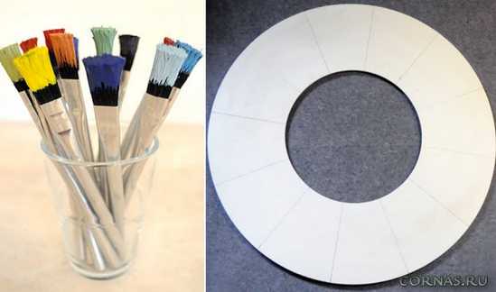 В первую очередь нужно вырезать из листа картона круг нужного диаметра, он и будет основанием, ложки будут держаться на нем. Внутри круга по центру вырезается еще круг чуть больше диаметра зеркала. На получившемся картонном кольце делается разметка — для фиксации первого ряда ложек (рисуем карандашом круг с отступом от края 1 см).