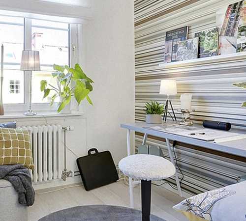 Известный и очень вкусный прием – это, конечно, полоски. Действительно, если вы расположите укладку напольных покрытий перпендикулярно длинным стенам и подчеркнете это полосатыми обоями на «короткой» стене, получится легкий, но заметный эффект расширения.