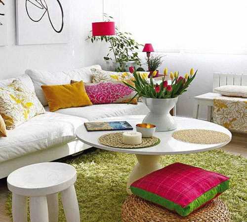 Замените традиционные квадратные и прямоугольные журнальные столики на столики круглой формы: острые углы зрительно делят комнату на части, сужая ее.