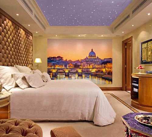 Голубые потолочные обои, увеличивающие пространство комнаты, как бы открывают небо над головой. В этом случае не используют припотолочные люстры. Но этот прием не подходит для людей с боязнью открытого пространства. Зато очень живописно смотрится такой потолок с веточками цветущей сакуры или свисающей хвоей на фотообоях. Тогда получается не только эффект расширения пространства и отрытого неба, но и создается ощущение близости с природой. В спальне также уместен эффект звездного неба на потолке.