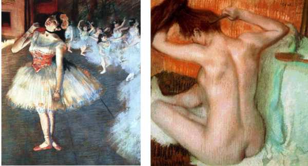 Излюбленной темой работ импрессиониста Эдгара Дега были прекрасные танцовщицы, закулисье театральных подмостков, кулуарные беседы в клубах и кафе. Хотя картины Дега относят к импрессионизму, он не признавал рисунка на пленэре, работая в студии. К тому же его живопись наполнена четкими линиями и точностью сюжета, что совершенно не типично для стиля.