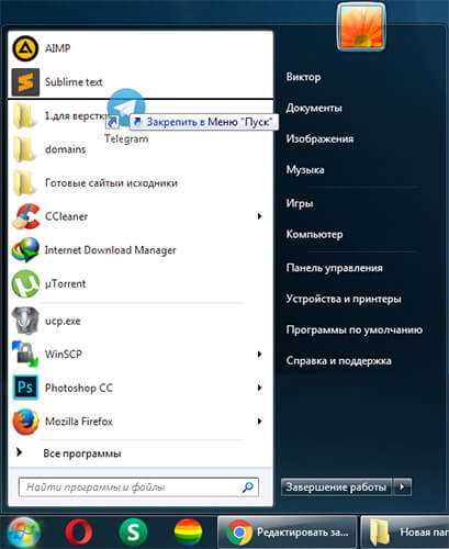 Второстепенные программы, которыми вы не так часто пользуетесь, можно вынести в меню «Пуск». Для этого переведите курсор на ярлык, зажмите левую клавишу мышки, нажмите кнопку «Win» и перетащите программу в нужное вам место.