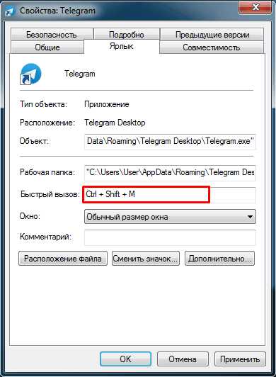 Еще один очень удобный вариант, которым пользуются не многие – назначить горячие клавиши для более оперативного доступа к нужной программе. Щелкаем по нужному ярлыку и переходим в его свойства. Щелкаем по полю «Быстрый вызов» и нажимаем на клавиатуре необходимую комбинацию (желательно чтобы она не использовалась в самой Windows), например, «CTRL+SHIFT+M».