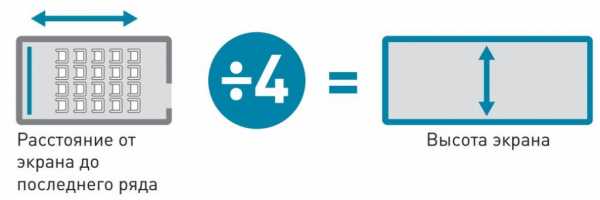 - Комфортное расстояние от зрителя до экрана. При использовании экрана в профессиональных или образовательных целях расстояние от первого ряда зрителей до экрана должно примерно в 1,5 раза превышать его высоту. В случае домашнего просмотра расстояние от первого ряда зрителей до экрана должно примерно в 2 раза превышать его высоту.