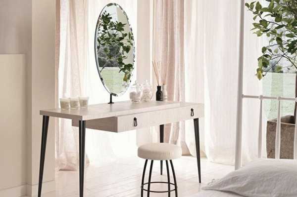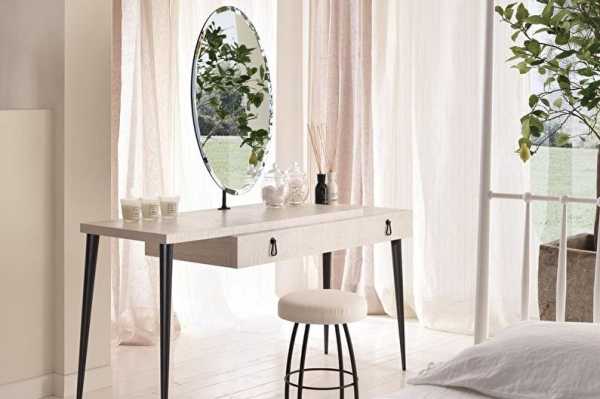 Столик с вращающимся зеркалом – имеет двустороннее зеркало, которое можно развернуть обычной или увеличенной стороной. Оно закреплено на подвижной платформе, поэтому размещать его нужно подальше от стены, чтобы была возможность его развернуть. Он идеален для нанесения макияжа или ухода за вашей кожей. Впишется в средние или большие комнаты из-за особенностей разворотного механизма.