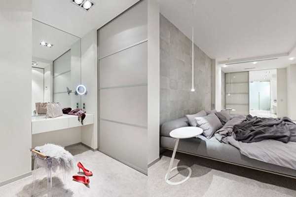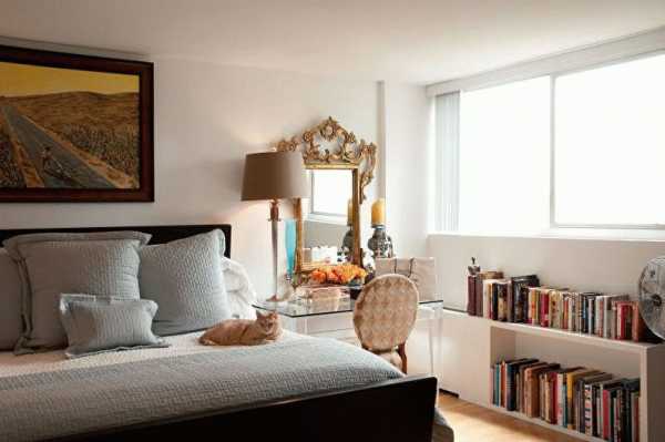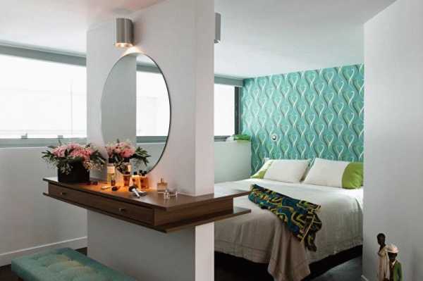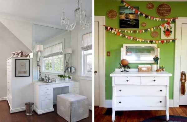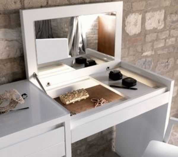 Столик-трансформер. Как можно понять из названия, вся идея заключается в двойном назначении этого элемента интерьера. Большую часть времени он будет представлять собой довольно полезный и компактный комод или тумбу, а при необходимости легким движением руки он трансформируется в туалетный столик с удобным зеркалом. Это удобное и элегантное решение для маленькой спальни.