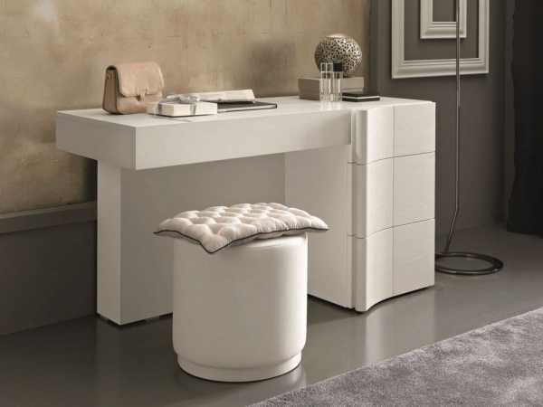 Консоль – туалетный столик со скрытым зеркалом, которое выдвигается по необходимости. Этот вариант имеет как плюсы – зеркало меньше загрязняется, так и минусы – размер его всегда ограничен площадью столешницы. Вы можете использовать такой стол не только по прямому назначению, но и как стол для ноутбука или заполнения бумаг.