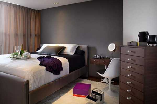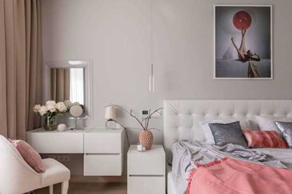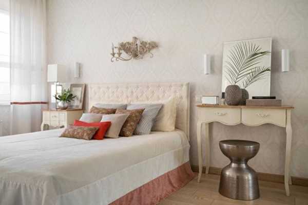 Вместо прикроватной тумбы. Замещение прикроватной тумбы туалетным столиком – довольно распространенная практика в современных спальнях. Это не только сохраняет квадратные метры комнаты, но и дарит удобство использования. Желательно подбирать подобную конфигурацию с небольшими стульями, которые не будут преграждать подход к кровати или окну. Идеальный вариант – это небольшие маленькие пуфики или стильные табуреты. К этому варианту можно отнести еще одно оригинальное решение – размещение столика перед кроватью, а не сбоку от нее.