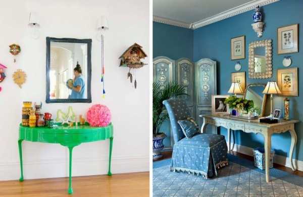 Если вы не сторонник круглосуточно открытых зеркал, то варианты с консольными зеркалами – для вас. Несколько зеркал одинаковой формы, но разного размера, прикрепленных на стене за столиком – еще один прекрасный вариант оформления.