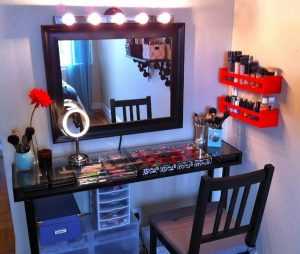 — Если комната позволяет, установите столик у окна. Естественное освещение – лучший спутник красивого макияжа и прекрасной прически. В противоположном случае установите боковые настенные светильники. Если вы желаете подойти к вопросу своего макияжа на более профессиональном уровне, то на помощь вам придет лампа-лупа.