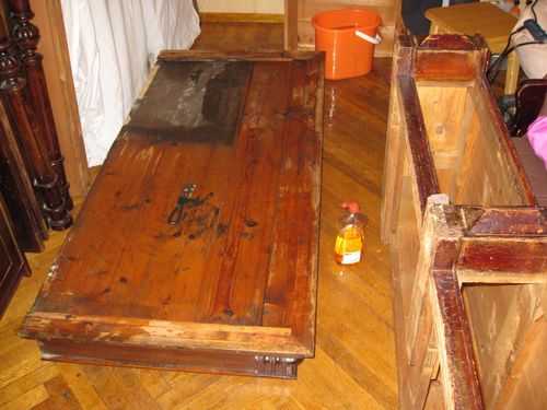 - Если на его плоскости был устаревший лакировочный слой, то полировку можно убрать или специализированным растворчиком, или ацетоном или скипидаром, выполняя все меры осторожности.