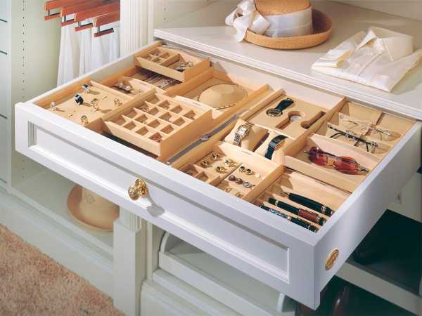 Украшения и очки мы часто храним в специальных органайзерах ила коробках. А можно сразу спроектировать такие органайзеры, которые будут встроены в полки.