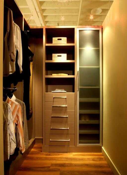 Вещи лучше хранить подальше от солнечных лучей, а вот людям нужен хотя бы искусственный свет, чтобы разобраться в том, что надеть. Поэтому очень важно продумать освещение комнаты без окон.