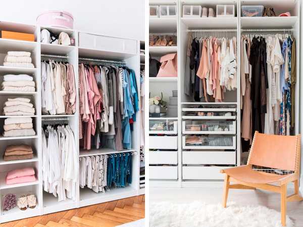 Подумайте, как вы собираетесь хранить вашу одежду. Я поклонница вешалок-плечиков. Так я могу видеть сразу всё. Одежда не мнётся, висит в полной боевой готовности, а места занимает даже меньше, чем в сложенном виде. Но, конечно, не абсолютно всю одежду можно так хранить.