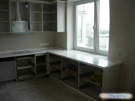 Поскольку напольный кухонный шкаф будет всего один, он же станет единственной рабочей поверхностью, придется осваивать подоконник. Обычно его удлиняют с помощью накладной панели, на которой удобно разместить бытовые приборы (комбайн, тостер или микроволновку). Пространство под подоконником используют для сооружения холодного шкафа или секции для посуды.