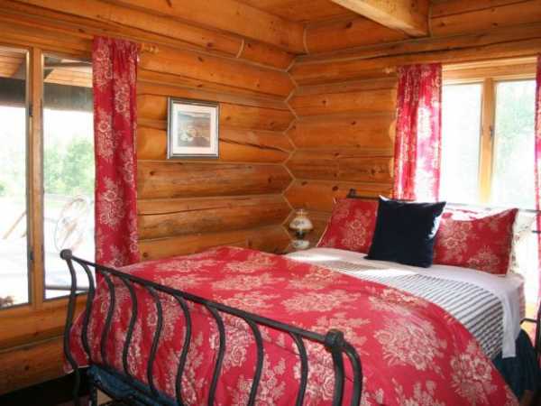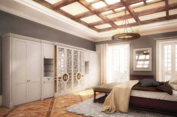 Если балки являются несущим конструктивным элементом, то их лучше сделать незаметными (выкрасить в тон потолка), задекорировать текстилем, либо сделать балдахин над кроватью.