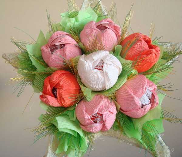 Все популярнее становится дарить на праздники букеты цветов с конфетами, в том числе и букеты из гофрированной бумаги.