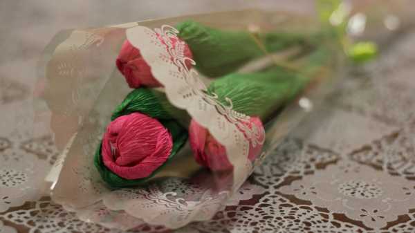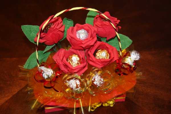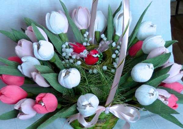 Можно преподнести оригинально конфеты, обернув их гофрированной бумагой, под цветы2. Корзинка с цветами из крепа с шоколадными серединками. Из гофрированной бумаги свернуть симпатичные бутончики, внутрь каждого поместить небольшую шоколадную конфету, сформировать букет, размесить в корзинке и преподнести в качестве подарка.