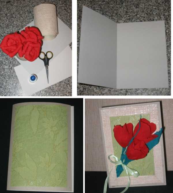 Цветы из крепа в корзинке с конфетами в основанииПодснежники из гофрированной бумаги с конфетами в корзинке3. Украшение на открытку. Несколько или один цветок из гофробумаги приклеить на поздравительную открытку.