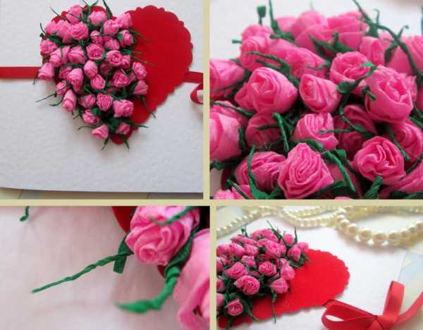 Объемная открытка с цветами из гофрированной бумаги4. Цветочное сердечко. Вырезать из картона сердце определенного размера и наклеить на его поверхность цветы из гофрированной бумаги. Цветы лучше делать одного размера и в одном тоне. Можно в двух-трех, сочетающихся: бело-розово-малиновая гамма, или красно-розовая.