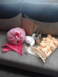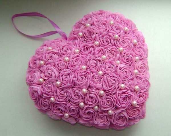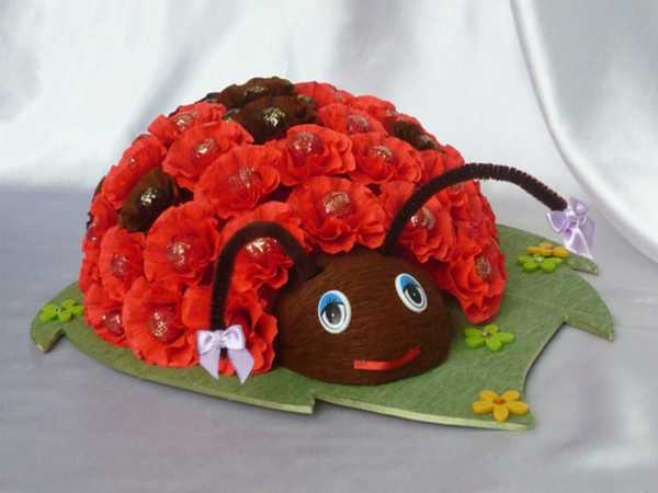 Объемное розовое сердце из цветов и бусин5. Божья коровка из цветов и конфет. Сделать объемный макет божьей коровки, украсив ее спинку красными цветами из гофрированной бумаги, вложив в центр каждого цветка по конфете, желательно в красных обертках. Чтобы не выделялись. А в качестве знаменитых точек используйте круглые шоколадные конфеты без оберток.