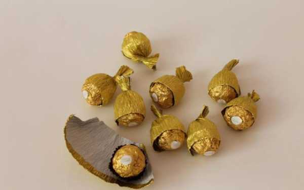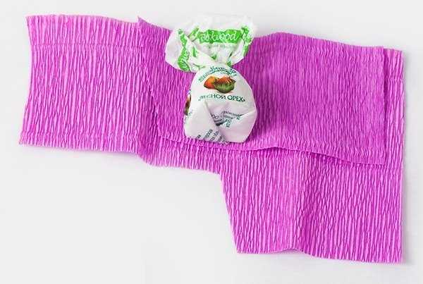 - Гофрированную бумагу разрезаем на куски 18х12 см. В эту нарезанную бумагу заворачиваем конфеты.