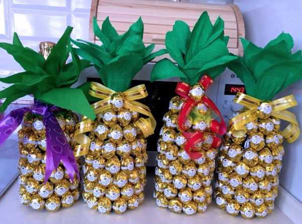 По окружности бутылки конфеты клеятся при помощи клеевого пистолета до самого горлышка. Вырезаются листья ананаса из бумаги и вставляются в горлышко. Завершающим этапом является украшение изделия на стыке конфет и листиков красивыми лентами, которые можно приобрести в любом цветочном магазине.