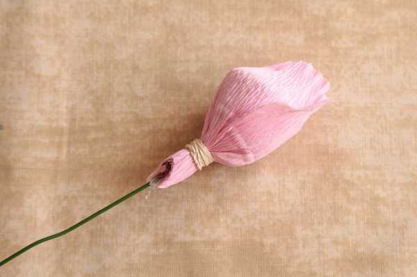- Узкую, жгутоподобную, часть тюльпана прикрепите к проволоке и хорошо зафиксируйте.