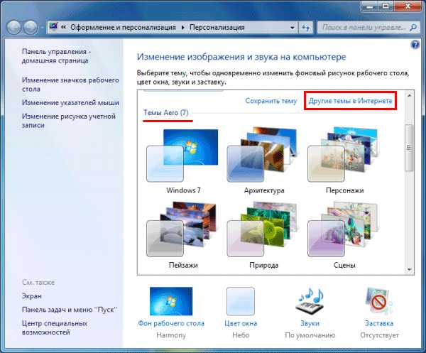 Выбор тут, конечно, не велик (всего 7 тем), но вы можете щелкнуть на строку «Другие темы в интернете» и выбрать классное оформление на сайте Microsoft.