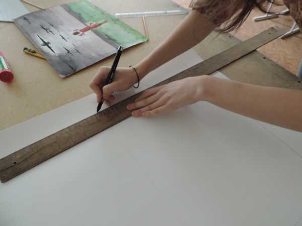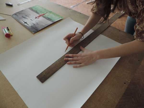 Затем берем линейку и вымеряем размер нашей картины. Прежде чем отложить полученную длину и ширину на бумагу, из каждого отрезка вычитаем 0.7 см. Допустим, у вас длина вашей готовой работы= 30см. Прекрасно! Вычитаем из длины 0.7 см и откладываем на нашем листе.Так же поступаем с шириной. Таким образом образовавшийся прямоугольник будет немного меньше реального размера картины. Это делается для того, чтобы когда мы будем отгибать края, делая окошко для паспарту, у нас не было бы видно края работы картины.