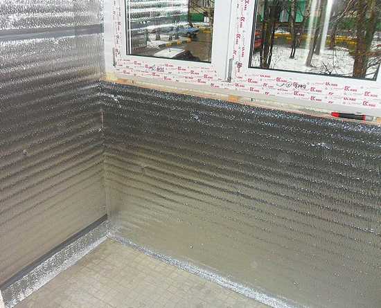 Его нужно крепить плотно и избегать деформаций, поскольку это приведет к нарушению утепляющих свойств. Такие материалы можно закрепить с помощью полиуретанового клея. Швы и стыки между листами можно заделать с помощью скотча и монтажной пены. Верхний слой утеплителя составляет изоляция из вспененного полиэтилена, покрытого фольгой. При установке следует поверхность с фольгой направлять внутрь балконного пространства.