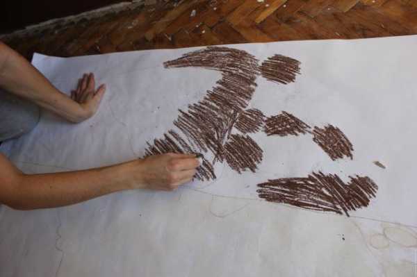 6. Натираем обратную сторону кальки с видимым рисунком мягким карандашом. На фотографии графитовый стержень, не уголь.