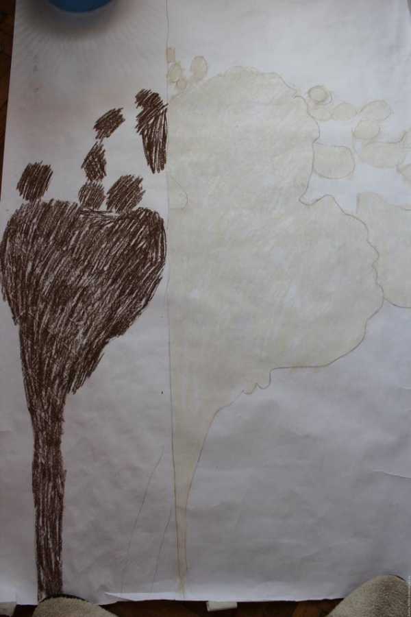 Берем понравившееся нам изображение, сканируем или скачиваем его в большом разрешении, а затем распечатываем в любом полиграфическом центре. (Я рисовала эскиз на компьютере в большом разрешении. Максимальный размер, который мне смогли напечатать — 115 x 90 см). Это меньше того размера, что мне нужно, поэтому я разрезала распечатку на 2 части и раздвинула его, а потом дорисовала недостающие части.