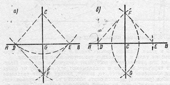 Прямой угол, т. е. равный 90°, образуется двумя взаимно перпендикулярными линиями. Перпендикуляр строится следующим образом. Опустить перпендикуляр. Из данной точки С (лежащей вне прямой), как из центра, произвольным радиусом описываем дугу так, чтобы она пересекла данную прямую в двух точках D и Е из этих точек, как из центров, одинаковыми радиусами описываем дуги, чтобы они…