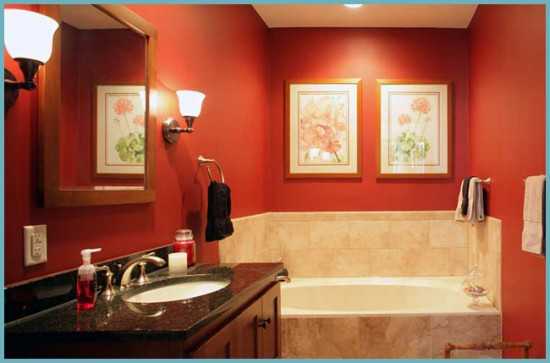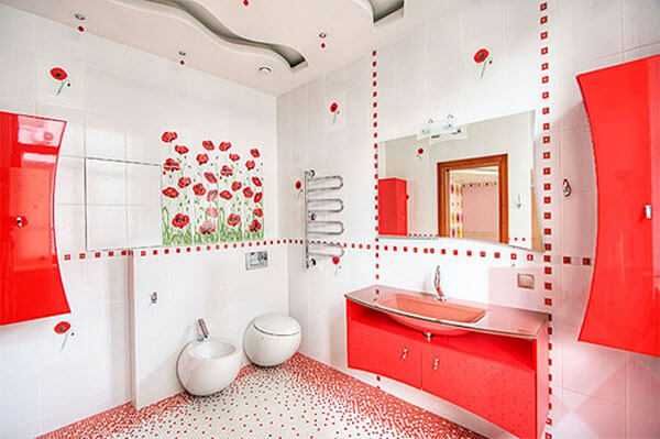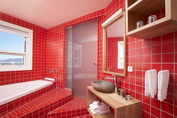 Яркие насыщенные тона — в небольшом количестве. Красный кафель в ванной — яркое настроение, но когда его слишком много, он вызывает тревожность