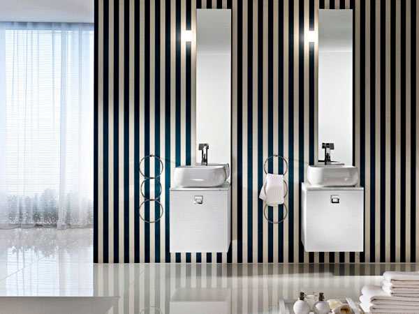 Если вы хотите визуально расширить ванную комнату, дизайнеры советуют сочетание вертикальных полос и маленькой плитки на полу.