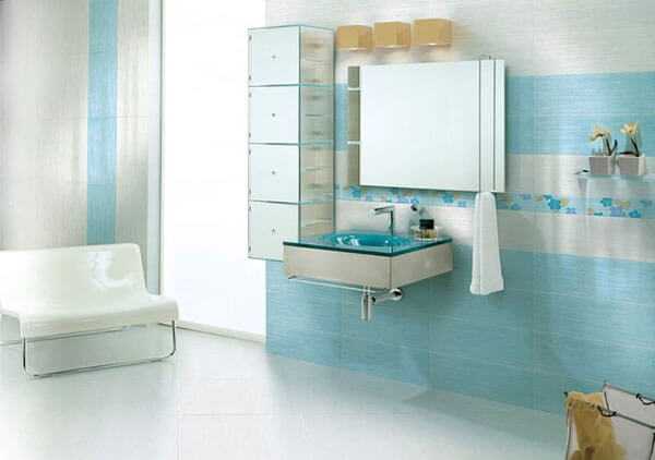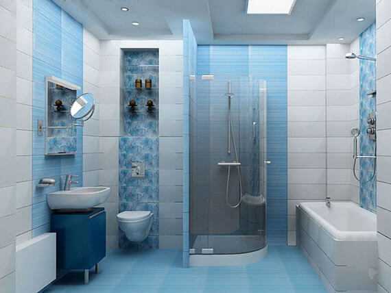 Считается, что более холодные тона добавляют объем помещению, а более теплые его немного уменьшают. Поэтому более выигрышно при маленьком размере комнаты будет смотреться светлый кафель различных оттенков синего цвета.